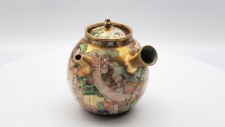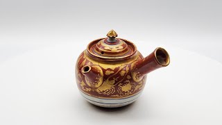 赤い上絵付で表面を塗り込めた地に、金彩で文様を描き、細部を針でかき落として文様を表現した一群の作例は、「金襴手」と呼ばれる。明・嘉靖年間(1522~66)に中国・景徳鎮の民窯で制作された金襴手の碗が、日本では懐石道具として用いられた。この急須は金襴手のスタイルによって、魚・蝦・蟹・海藻を描いている