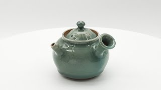 やや小ぶりの急須で、青磁釉が厚く掛かるためその発色はやや暗い。側面に彫り表された宝相華(ほうぞうげ)文は、周平が天保3年から5年(1832~34)頃に技術指導に赴いた、淡路島の珉平焼で作られた青磁花唐草文水指(兵庫陶芸美術館蔵・田中寛コレクション)の文様と近似している。従って、周平の手元にあった絵手本帳などを通して、その図様が珉平焼へと伝播したことが想定できる。