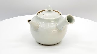 把手裏の青い染付銘以外、文字や絵付が一切ない無地の急須。絵付け前の最もシンプルな急須の形態が分かる。この急須は、周平が自ら作品名を記した共箱に収まっていないが、ほぼ同じ周平作の白磁急須(個人蔵)を収めた箱に、周平自らが「白高麗急須」と記している。従って、当時朝鮮半島製の白磁と認識されて「白高麗」と呼ばれた、徳化窯(とっかよう)など中国南部の窯で制作された白磁を意識したことが分かる。