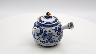 染付によって、唐草の間を跳ね遊ぶ兎の姿が描かれている。類似する文様を金襴手で表した周平の作例として、入間市博物館所蔵の急須と個人蔵の煎茶碗が確認できる。従って、このような図案が描かれた絵手本帳をもとに、その時々に応じて染付や金襴手で絵付けを行っていた制作状況を窺うことができる。型成形による蓋の摘みには、赤褐色に発色する鉄の顔料が塗られており、青一色の急須にアクセントを添えている。